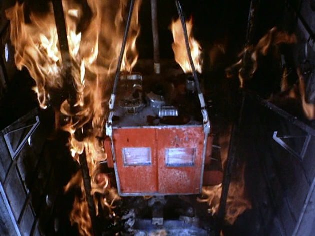 Scott in Thunderbird 1 and Virgil and Alan in Thunderbird 2 hurry to the danger zone, where they set up the Dicetylene Cage in the lift shaft. The cage lowers Virgil and Alan