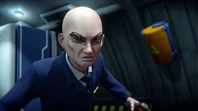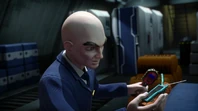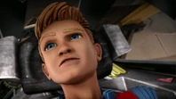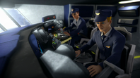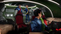 Meanwhile, aboard Fireflash, a suspicious Kayo asks the co-pilot about why they are changing direction and contacts John with no response. In the cockpit, Captain Hanson renders the copilot unconscious with a handheld device and uses the oxygen masks to knock the passengers out. Kayo, who didn’t put on a mask, enters the cockpit and finds a cloaking device under the control panel. After tearing it out, she contacts Tracy Island and Thunderbird 5 about Fireflash being hijacked by its own captain. Scott explains that the staff at Heathrow found the real Captain Hanson in a locker and the other Hanson was the Hood in disguise.