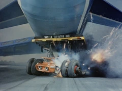 Plotting to lure the International Rescue craft, The Hood straps a bomb to the landing gear of the atomic-powered airliner. If the crew attemps a landing by conventional means the bomb will detonate. International Rescue saves the day by using their Elevator Cars for the aircraft to land on.