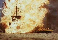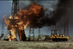 International Rescue are called to action in Terror in New York City when an oil well burns out of control. Scott oversees the operation from a near by gantry, while Virgil in the Firefly fires a charge into the base of the fire to extinguish the flames.