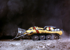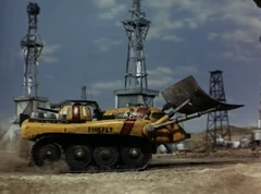 The Firefly is a pod vehicle designed by Brains. A dual-purpose fire-fighting and debris-clearance vehicle, Firefly's forward-mounted shield is constructed of Cahelium Extract-X - providing heat protection from intense temperatures and resilient dozer- blade capability. The shield allows access for the barrel of a heavy-duty gun armed with nitro-glycerine shells. These can be used to snuff out otherwise-uncontrollable fires, and for major debris clearance. Rear-mounted water and foam dispensers can be used for vehicle-cooling purposes, and for blaze control.