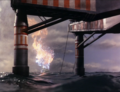 Another jet of gas bursts through the sea bed and the resulting wave fractures one of the rigs legs. Hooper and O'Shea go down in the diving bell to check the damage, but a third column of flame then explodes, causing the rig to slip further and the diving bell crashes to the sea bed. Hooper and O'Shea are trapped!