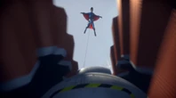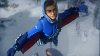 Scott jumps off the ledge and glides after the balloon