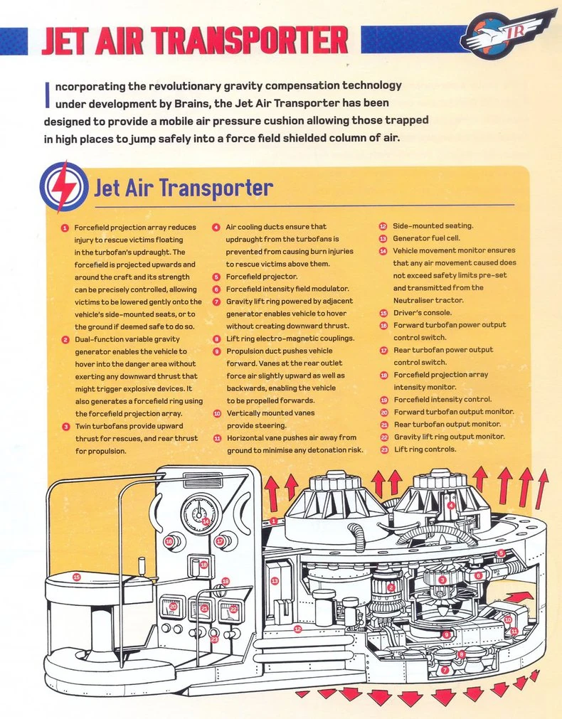The Jet-Air Transporter (also known as the Hoverbed) is an International Rescue pod vehicle that helps save people jumping off heights. Turbo fans on the Jet-Air Transporter help people float. Anyone jumping who comes within 20 feet of the turbo fans will be saved, due to the Jet-Air Transporter having a "catchment" area incorporated into its technology.