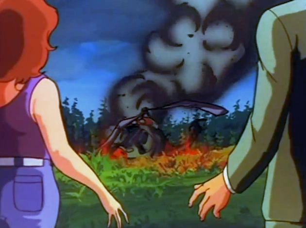 A helicopter crash starts a forest fire.