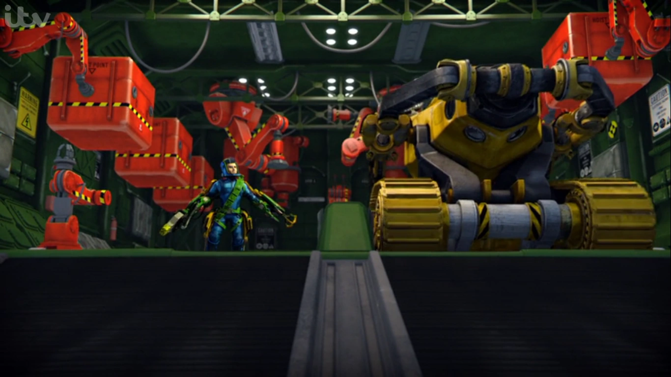 To launch the debris clearance Pod Explorer, the operator steps on the platform in Thunderbird 2’s cockpit, lowering them into the module. They then select the Pod Explorer configuration. Robotic arms attach the debris clearance pincers to the front, the ground travel trolley with caterpillar tracks to the bottom, and the grapple launcher to the back. Once configured, the operator gets into the POD, and the module door opens, ready for the Pod Explorer to be deployed.