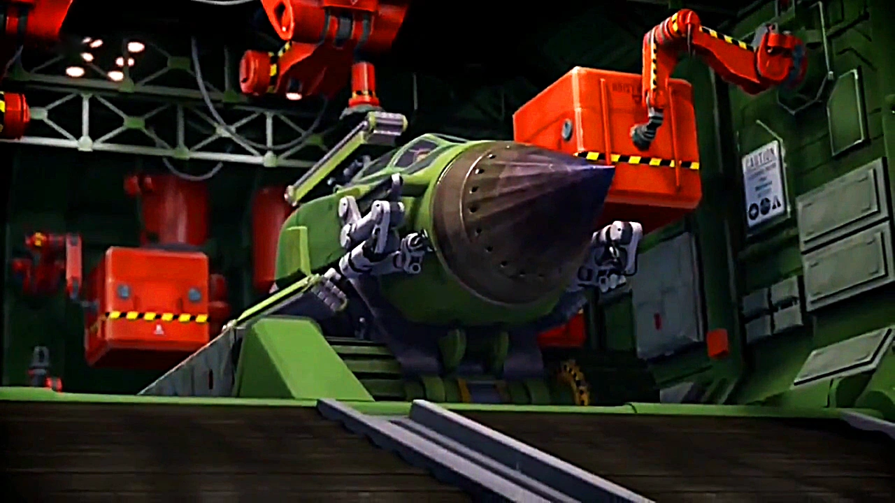 To launch the Sherpa Pod, the operator steps on the platform in Thunderbird 2’s cockpit, lowering them into the module. They then select the Sherpa Pod configuration. Robotic arms attach the ground travel trolley with caterpillar tracks to the bottom, the underground travel caterpillar tracks to the top and sides, and the heat cone to the front. Once configured, the operator gets into the Earth Pod, and the Module door opens, ready for the Sherpa Pod to be deployed.