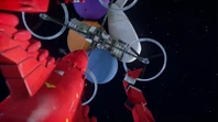 When Thunderbird 2 reaches CIR.R.U.S, Gordon assembles a pod with four heliblades and a grappling arm and flies it towards CIR.R.U.S to fix its rotors. While Thunderbird 2 lowers its forward struts to steady the station, it gets electrified by a massive voltage, causing the ship to fall. Gordon re-docks the pod and re-activates Thunderbird 2’s systems via the pod’s controls. While Virgil and Gordon break off, Scott ziplines down from Thunderbird 1 and onto CIR.R.U.S’s outer balcony. Suddenly, he gets knocked off by a series of plasma discharges which Brains referred to as “sprites”. Scott uses his grappling hook and he climbs back into Thunderbird 1’s cockpit and breaks off when Thunderbird 1’s engines start to stall.