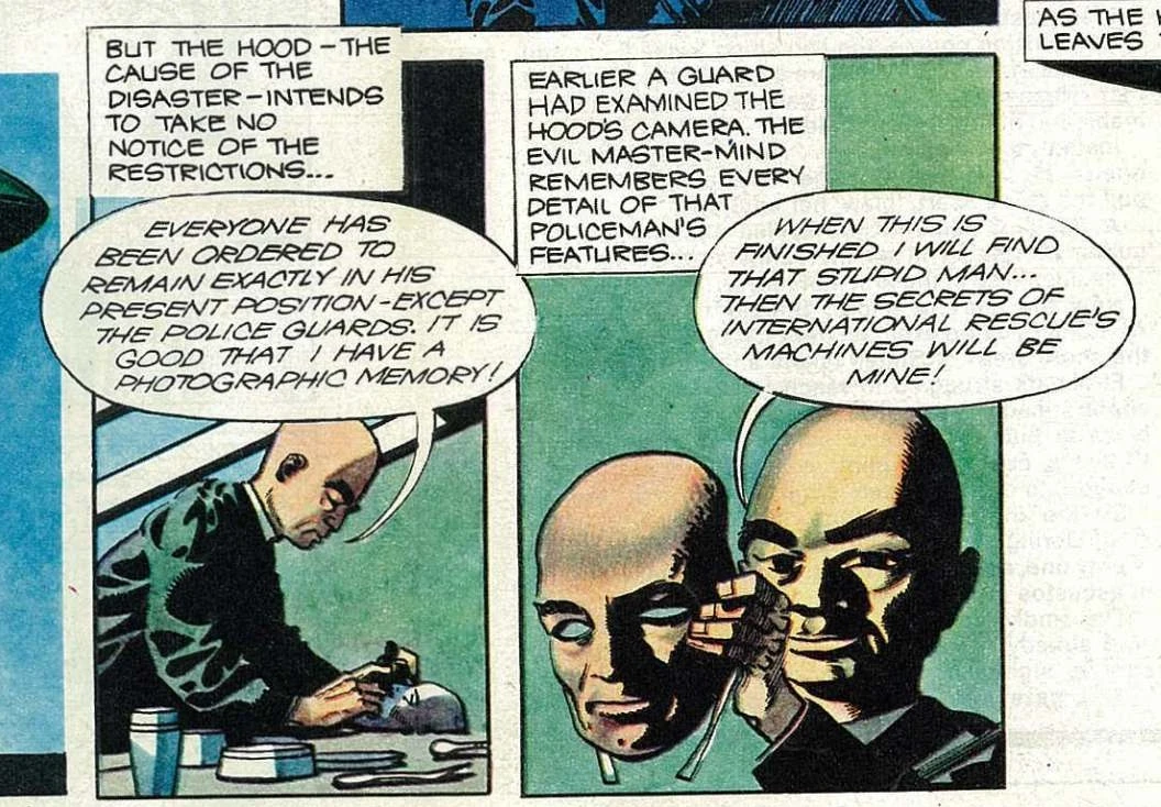 However, due to his photographic memory, he makes a clever, realistic mask of Sweeney's face and returns, knocks the officer out and takes his place. Afterwards, he photographs Thunderbird 1 but upon making his escape, Sweeney returns and attacks the Hood who shoots him and makes his escape in his private jet. Alerted by the guard, Scott gives chase in Thunderbird 1 and shoots his jet, causing the villain to eject but in the process he drops his camera and it is destroyed...