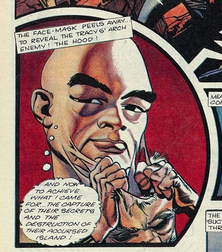 Feared as the world's most dangerous man, an individual primarily known only as "the Hood" (his alias coming from his many disguises) is the half-brother of Kyrano and the uncle of Tin-Tin. He wields an uncanny supernatural power over his brother. Unlike him, he is massive in stature and his main aim in life is the acquisition of wealth, regardless of justice and ethics. His primary target is International Rescue, as the plans of their amazing high-tech vehicles and machines could make him rich beyond his wildest dreams. To this end, he's been known to create several disasters in an attempt to photograph their machines in action - such as sabotaging the Fireflash's maiden flight by planting a bomb, causing actors for a film to be trapped in a cave, or even attempting to sneak a miniature camera, in the form of a remote-controlled mouse, into Thunderbird 2.