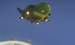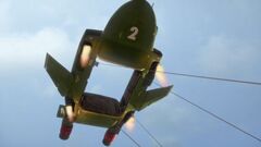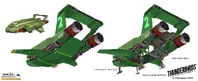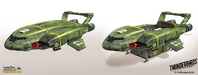 TB2 is a giant, wide-body, green coloured, somewhat blocky plane with small forward-swept wings, a massive rear spoiler and large rectangular engine intakes on either side. Despite its bulky appearance and the slowest of all 4 flight-capable Thunderbirds, the two rearward engines are powerful enough to allow it to fly at supersonic speeds nonetheless. TB2 is capable of vertical take-off and landing through the use of 4 large jets tucked underneath the craft's sides, close to the intakes. The VTOL jets can tilt forwards and backwards for slow and steady flights in all directions, and are powerful enough to let TB2 lift extremely heavy objects and vehicles, having once picked up TB1 with no apparent difficulty. The wings can fold upwards when not in use, allowing for easier landings. Two means of entrance and exit can be found at the craft's front end; a manually operated hatch on top, and a platform that can be automatically lowered underneath, and both lead straight to the cockpit.