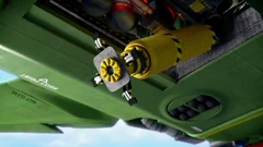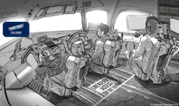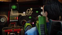 Thunderbird 2’s cockpit is a semi-circle, with three seats for pilot positions. At the front, on the right is the primary pilot seat, with the majority of the flight controls. In front of the pilot is a wheel that controls that direction and altitude of the craft. On the right of the pilot is a panel with two control cylinders and four buttons that control the movement and features of the module. Above the pilot is a panel containing a control cylinder and a series of switched that controls the non-module features of Thunderbird 2. On the left is the primary co-pilot, with assisting flight controls. In front of the co-pilot is a wheel that can control the direction and altitude of the craft. On the left of the co-pilot is a panel with a series of switches that grants greater control of the VTOL thrusters to both the pilot and the co-pilot. On the left of this panel is a button panel that controls the airframe of Thunderbird 2, which includes the engine intakes and the spoiler. Above the co-pilot is a containing a control cylinder and a series of switches that control the fine positioning of the wings and some of the equipment in Thunderbird 2. In between the pilot and co-pilot consoles is a divider console that contains a large lever controlling the speed of Thunderbird 2. Above this is a smaller lever that controls the extension of the legs, with a series of buttons above this controlling the inside of the module and the activation of the legs. Behind the pilot seat is a position for a secondary co-pilot, which controls the programming of Thunderbird 2. Connected to the chair on the right of the co-pilot is a button panel connected to an arm. This panel contains a holographic emitter and is able to control the tools and equipment of Thunderbird 2. On the side wall of this console is a series of buttons and switches. These are able to control the thrusters and airframe of Thunderbird 2, as well as the autopilot programming of the ship. At the back of the cockpit is a door that leads to the module. In front of this is a platform that can raise up to the manually operated hatch, as well as down to the module or to the underneath of the cockpit.