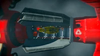 Thunderbird 3’s cockpit has a square floor plan and is able to rotate around the diameter of the rocket to provide the best possible view for the pilot. On the pilot console are two control cylinders, one on the left and one on the right that control the direction of the craft. There are two other control cylinders in between primary two that gives the pilot finer control over the rotation of Thunderbird 3 as well as a small amount of control over the grasping arms. On the right of the pilot is a console containing two levers. The lever on the left controls the activation of the grasping arms, and the lever on the right controls the activation of the primary and secondary thrusters. On the left of the pilot is the co-pilot console, with a series of buttons, switches and sliders. These give the co-pilot finer control over the rotation of the cockpit, the movement of the grasping arms, the fine positioning nozzles and the airlocks of Thunderbird 3. On the right of the co-pilot is a console containing four levers. These control the tools at the end of the grasping arms. In between the pilot and co-pilot is a divider console that controls the speed of Thunderbird 3. At the back of the cockpit is a door that leads to the cargo bay. On either side of this door are consoles that control the autopilot, power and life support systems of Thunderbird 3.