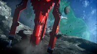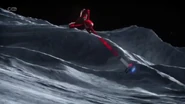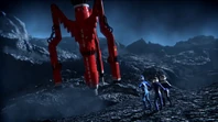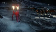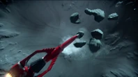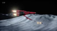 Alan and Scott took Thunderbird 3 to the moon to rescue Captain Lee Taylor from a meteor shower. Scott jumped from Thunderbird 3 over Shadow Alpha base. After helping Taylor defend the base against the meteors with its laser cannons, Scott told John to transmit new landing coordinates for Alan to rendezvous with him and Taylor outside the meteor strike zone. As the lunar transport approaches Thunderbird 3 which landed, one of the meteors was about to crash into it but Scott and Taylor ejected from the buggy into the cargo hold and launched before the rock hit the ship.