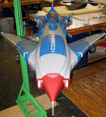 This model shows how the design of Thunderbird 2 would have looked like for the Series. The model also included an Illuminating Cockpit that also features a miniature figurine of Virgil Tracy, Navigational beacons, Removable Pod lid, and Spinning Turbines air intakes housed within the model. This Model of Thunderbird 2 measures at 3 foot in length and it was made out of Fibreglass for the main body. The wings, the spoiler and the thrusters are made from Resin that was made from a Silicone mould. A miniature prototype was created out of styrofoam for the main body, as well as using wood for the wings and the side panels for the model.